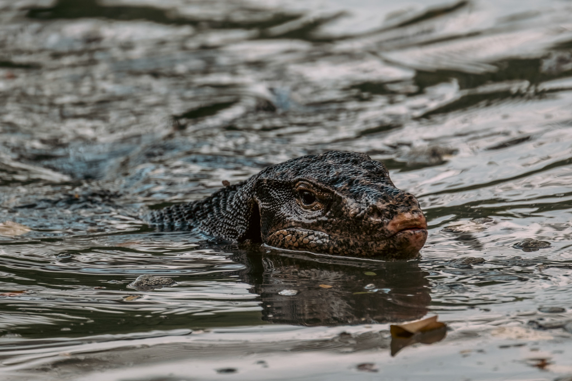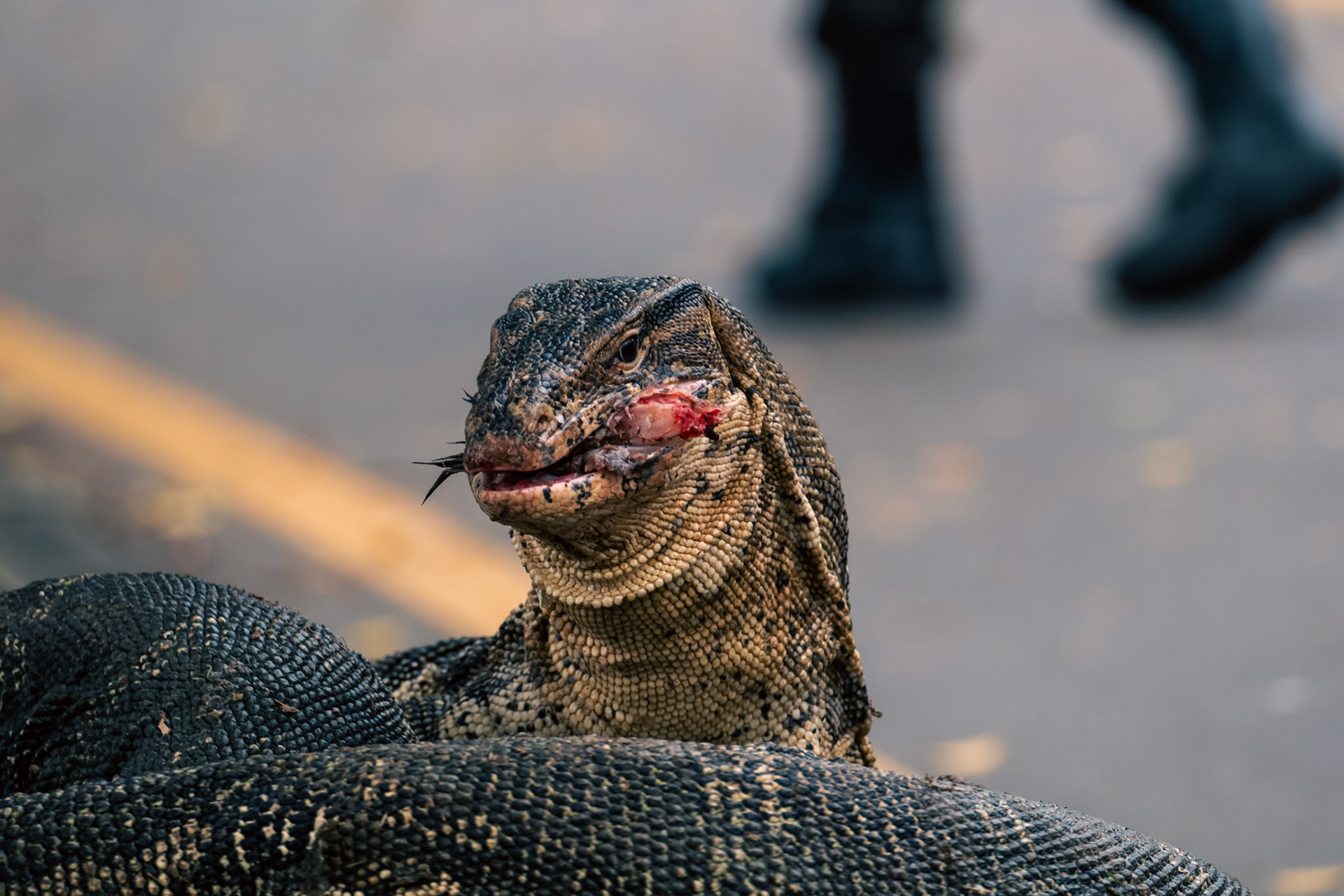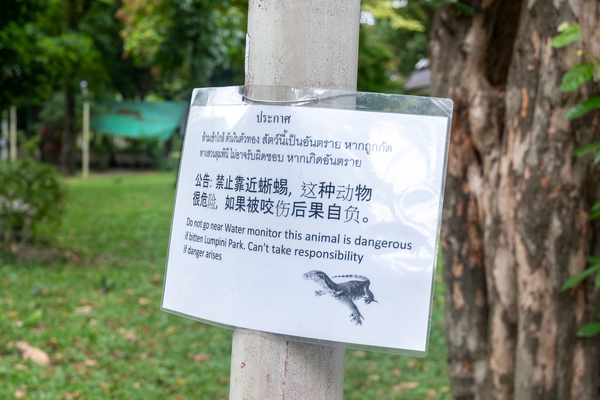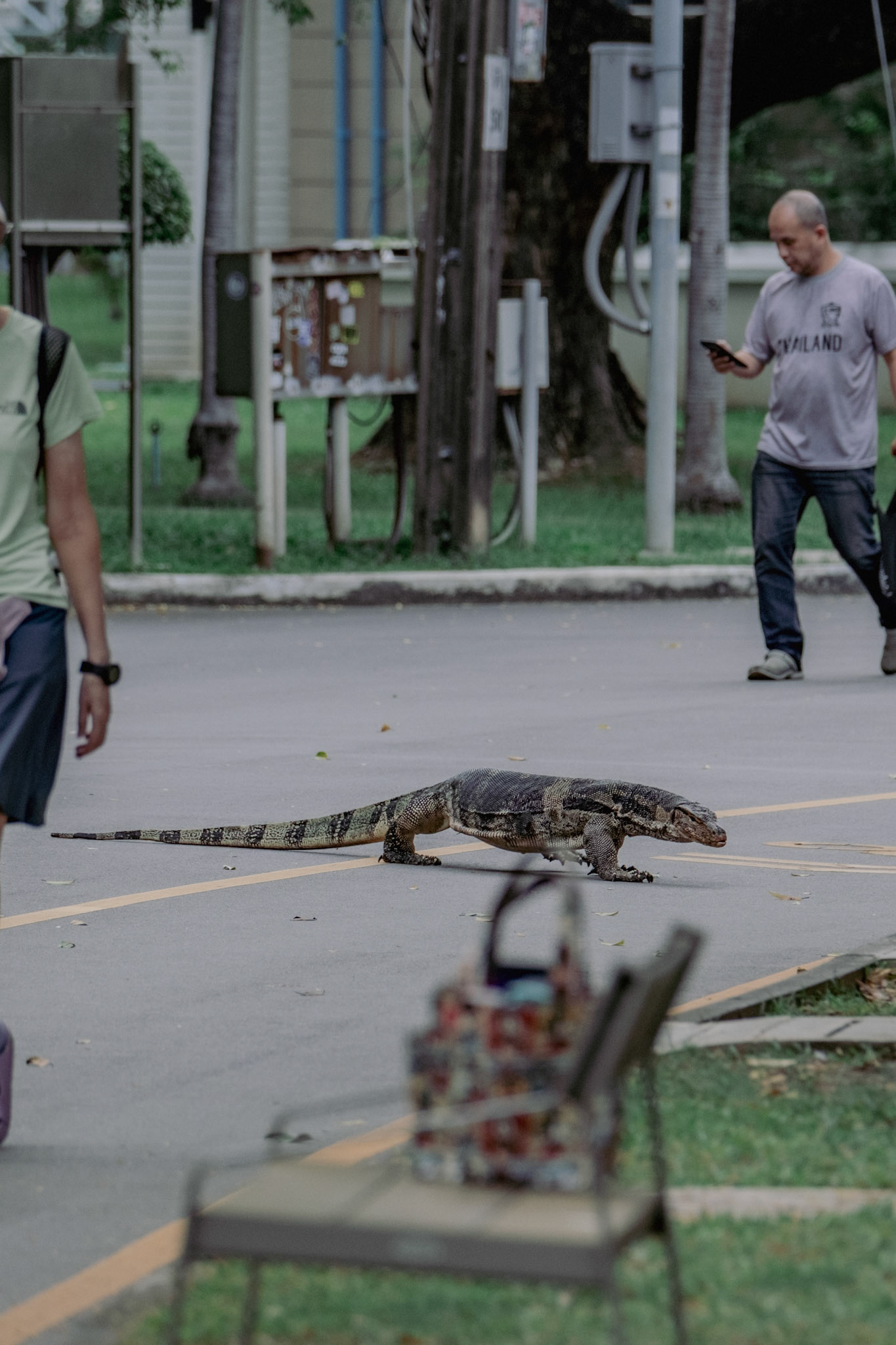 Water Monitors fight for a fish in Lumphini Park as people walk by.
