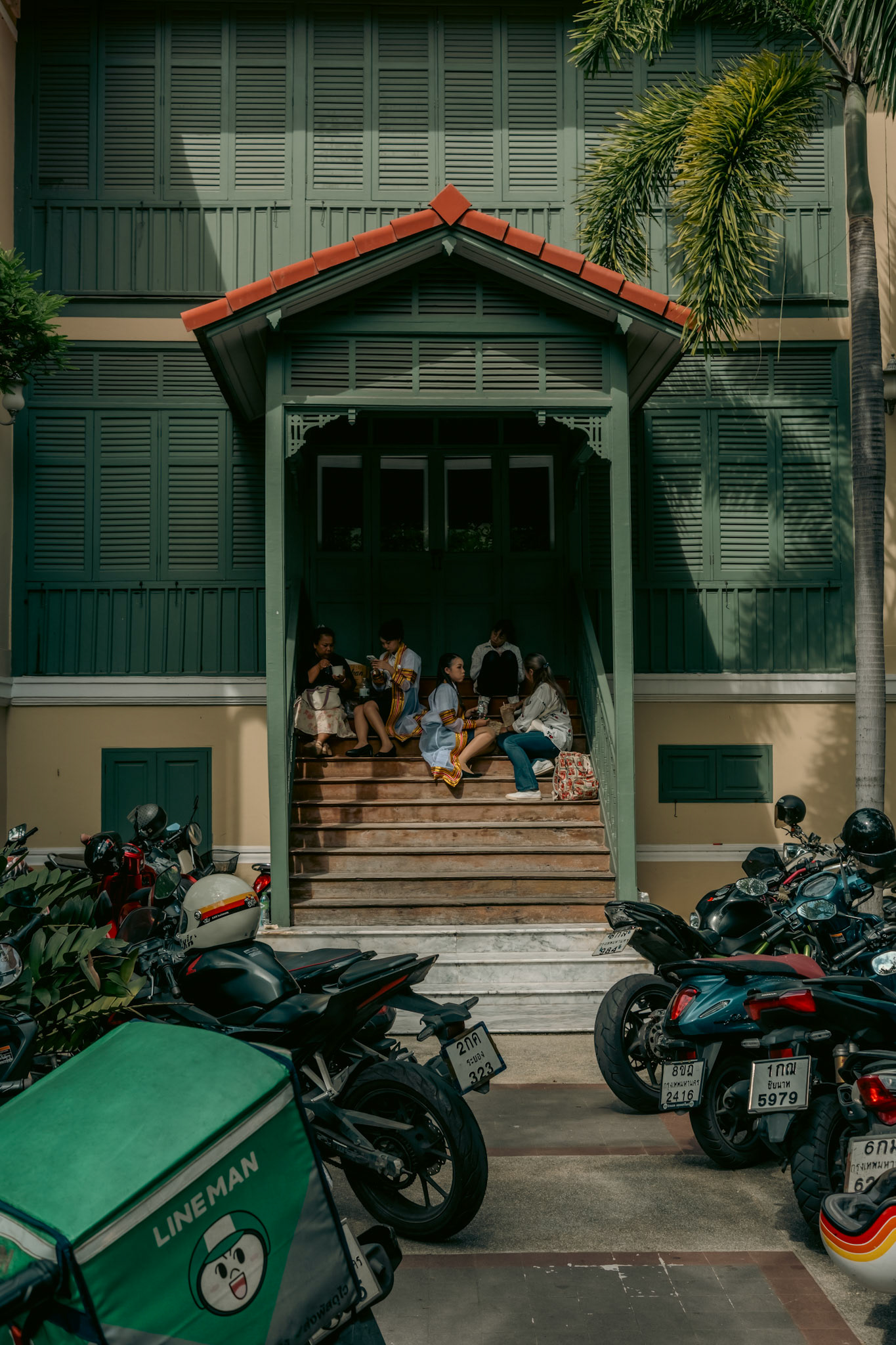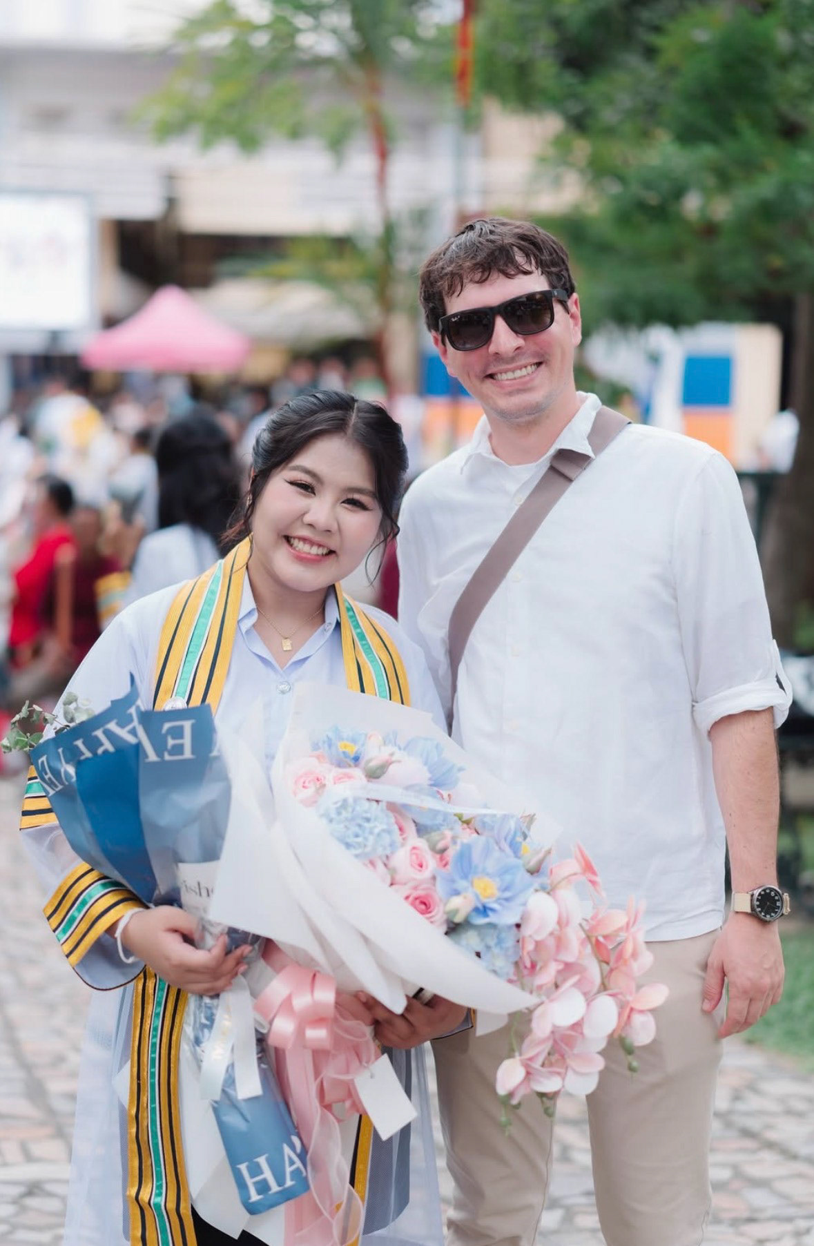 Part of the college graduation ceremonies in Thailand gather graduates at the center of a circle while underclassmen dance and sing around them.